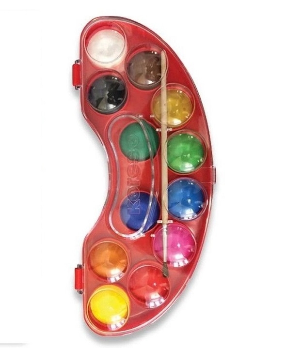 Комплект водни бои с 12 ярки и добре покривни цвята, подходящи за училищна и свободна творческа дейност, подредени в удобна пластмасова кутия с капак и включена четка за лесно рисуване и смесване на цветове