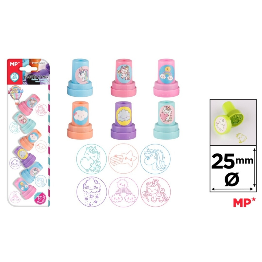 Детски печати с пластмасова дръжка, която се адаптира идеално към малките ръчички на най-малките.В различни цветове и дизайни. Идеални са за награждаване на най-малките, за украса на работа, занаяти или просто за щамповане и оцветяване. Те развиват креативността и въображението със забавния си дизайн и цветове!Блистер от 6 различни единици.