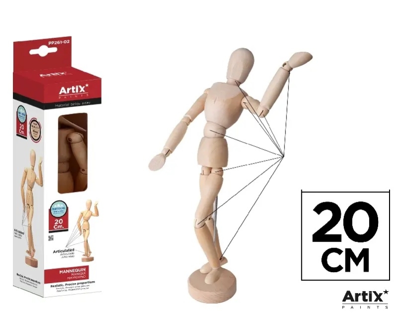 Дървеният манекен с височина 20 см е подвижен дървен модел, който служи за изучаване на човешките пропорции, движения и форми при рисуване и чертане; моделът е стабилен за настолна употреба и подходящ както за ученици и студенти, така и за професионални художници и дизайнери.