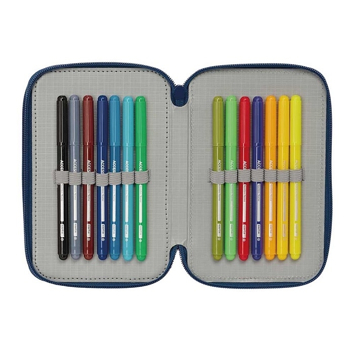 - съдържа 37 части: гумичка, графитен молив, синьо-червен химикал, острилка за моливи, гравирана синя линийка и полукръг (1-во отделение), 16 дървени цветни молива (2-ро отделение)